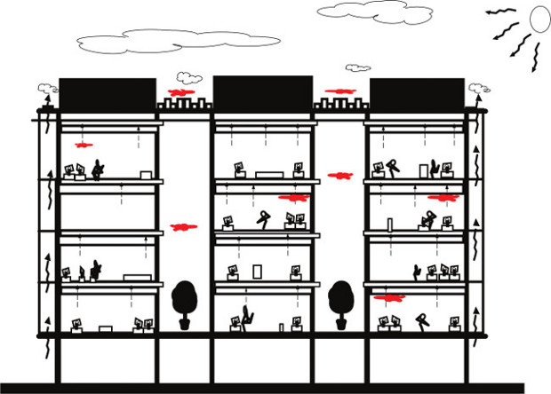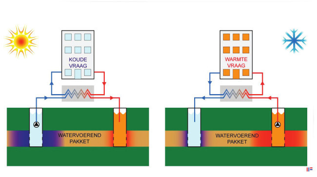 In goed geïsoleerde gebouwen wordt het 's zomers heel warm. Grote energie slurpende koelinstallaties moeten de temperatuur dan op een aangenaam niveau houden. Dat kan veel goedkoper, door de warmte op te slaan op plekken waar niemand er last van heeft.