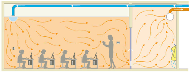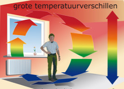 In een ruimte met mensen stijgt de temperatuur snel als gevolg van lichaamswarmte en een eventuele verwarming. Daardoor daalt de luchtvochtigheid. De warme lucht zal – volgens eeuwenoude natuurkundige principes – langzaam naar het plafond stijgen, samen met vervuiling door uitgeademde lucht, transpiratie, schoonmaakmiddelen, etc. Boven in de ruimte wordt het dus het warmst en het sterkst vervuild, maar in de hele ruimte ontstaat een bedompte en benauwde atmosfeer.