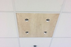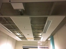Om de problemen op te lossen is het toevoerrooster vervangen. Omdat in de markt verkrijgbare roosters niet in staat zijn de specifieke problemen in dit gebouw op te lossen, heeft Frans Rasenberg in samenwerking met de Halton B.V. een nieuw rooster ontwikkeld. Dat heeft vier nozzles (foto 1). Door een combinatie van de inblaassnelheid van de lucht en de stand van de nozzels komt de lucht in de hele ruimte in beweging en kan via het afvoerrooster worden afgevoerd. Om de warmteoverdracht tussen het beton en de ruimte te verbeteren zijn de plafondplaten uit het plafondeiland verwijderd (foto 2). In een later stadium zijn nieuwe designplaten geplaatst (foto boven), waarmee wel voldoende warmteoverdracht plaats vindt.